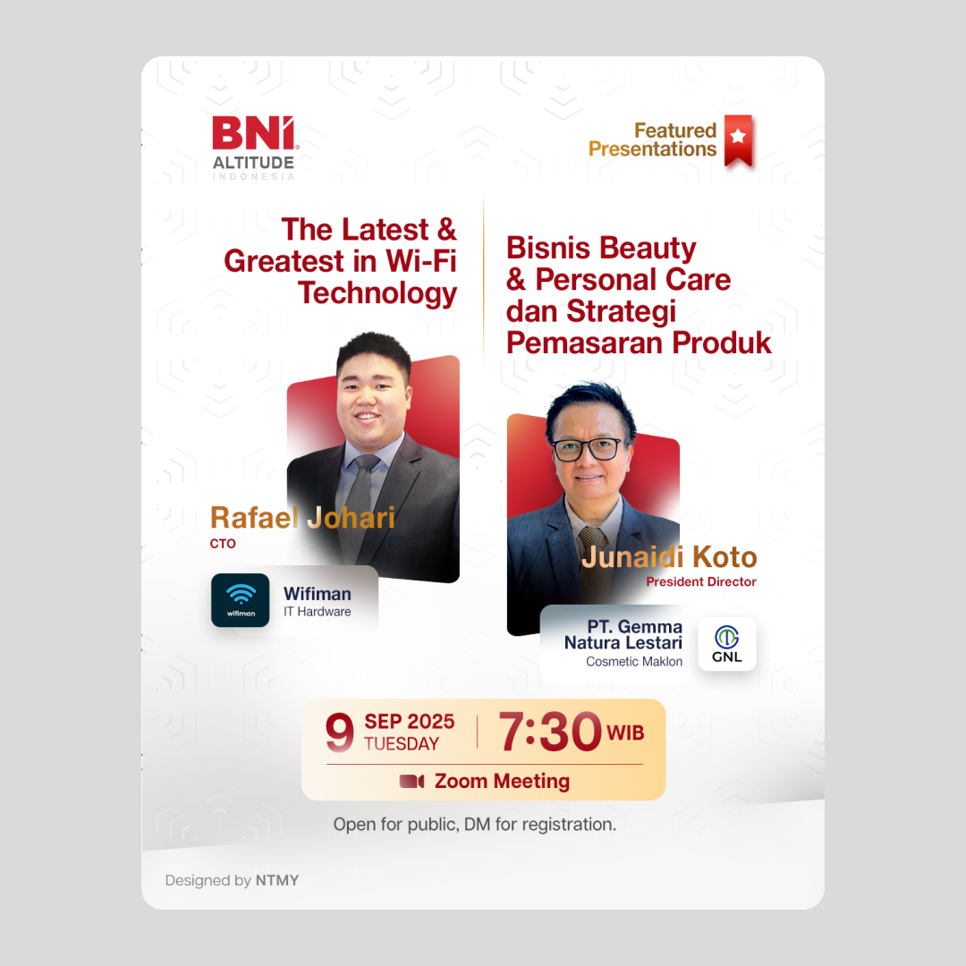 Zoom , IndonesiaAt BNI Altitude, every Tuesday is more than just a meeting — it’s a chance to strengthen trust, create visibility, and open new doors for your business. With high-energy networking, intentional sharing, and meaningful conversations, each session fuels your growth. Whether you're a seasoned member or just starting your journey, your presence makes a difference. […]
